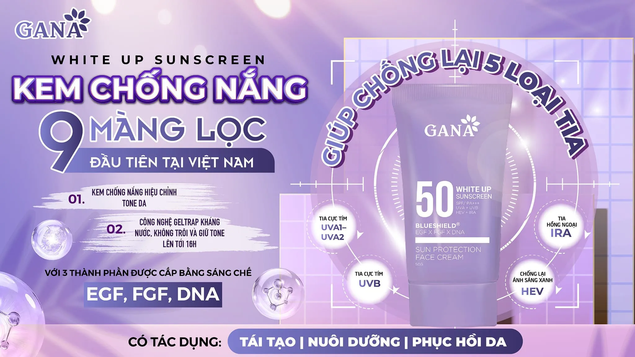 3 hoạt chất vàng tái tạo da: Gana chứa EGF, FGF, DNA – giúp tái tạo cấu trúc da, cải thiện nếp nhăn, tăng độ đàn hồi và ngăn ngừa rối loạn sắc tố, chống lão hóa rõ rệt sau thời gian ngắn sử dụng.